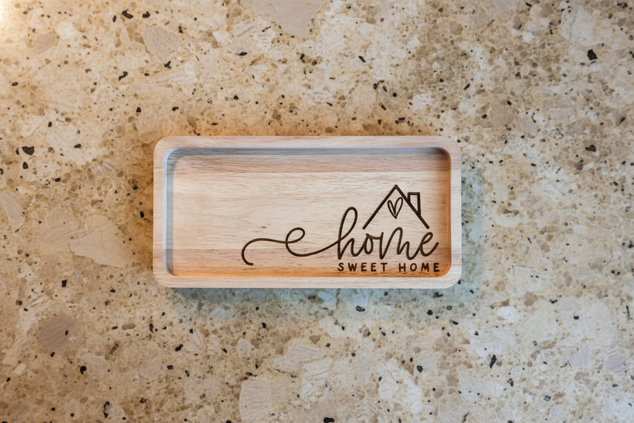 Engraved wood key tray with Home Sweet Home design personalized entryway catchall tray for keys and wallet
