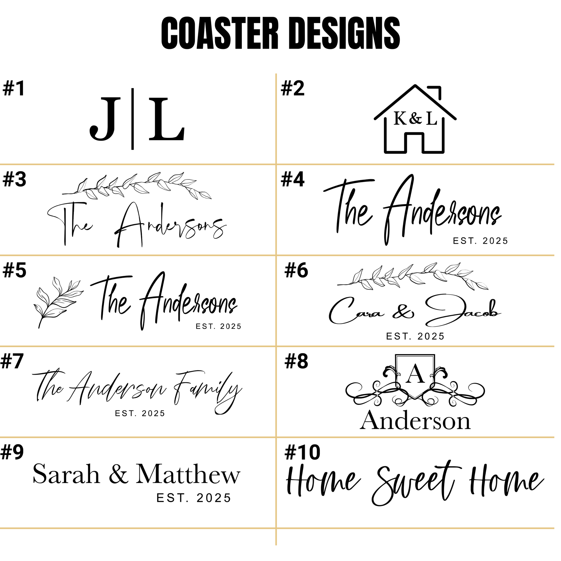 Collection of coaster designs with various monograms and text styles on a white background.