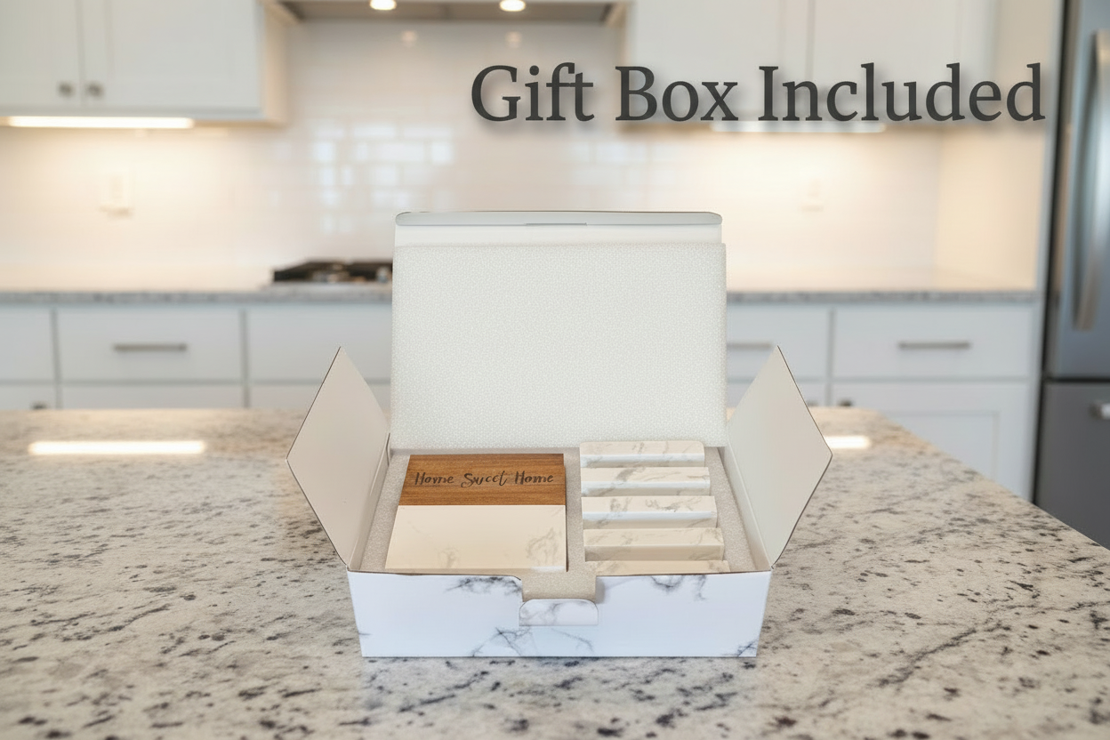 PERSONALIZED WOOD COASTER GIFT BOX WITH MARBLE AND ACACIA WEDDING AND CLOSING GIFT BASKET SET