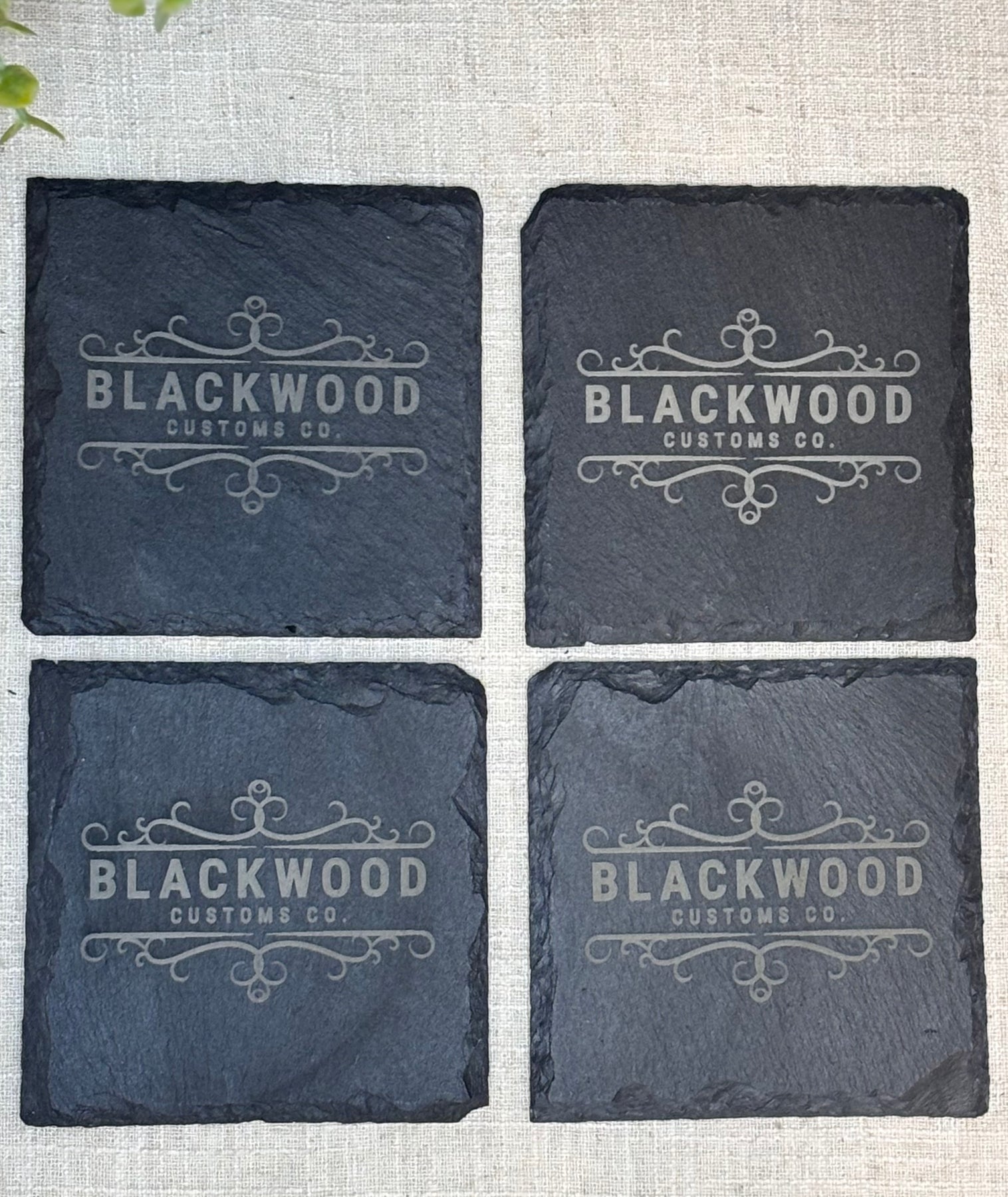 Set of four custom slate coasters with engraved branding for corporate gifts